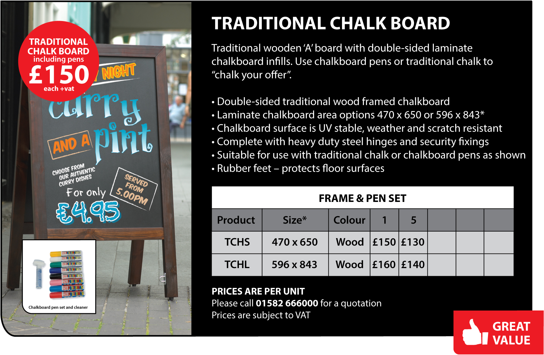 From high street to side street, from pavement to shopping mall our outdoor range comprises of swing signs, chalk boards, ‘A’ boards and forecourt signage. In addition, our trio of café banner systems are perfect for advertising in seating and hospitality areas.